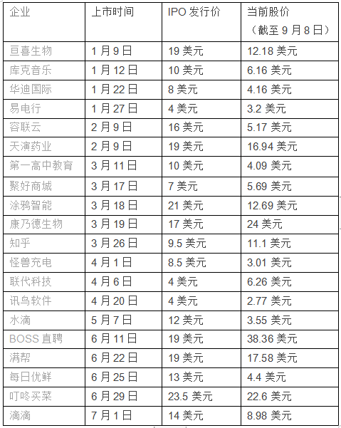 根据“极点商业”统计,截至美东时间9月8日,30多家赴美敲钟的中概股中,当前股价高于IPO发行价的企业,不超过5家。