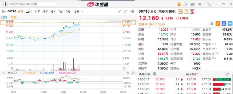 华盛资讯9月10日消息,京东方精电午后快速拉升涨超11%,报12.16港元,突破近期阶段高价,创2000年7月以来新高价,总市值达89.5亿港元。