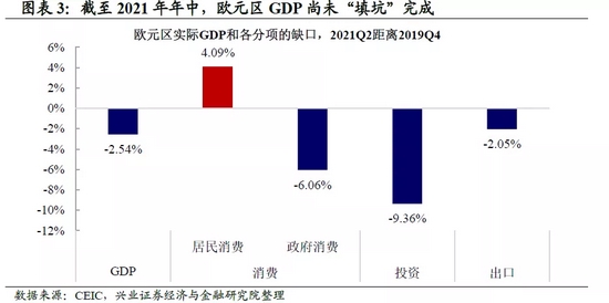 GDP:还剩少量“坑”未填,投资是主要拖累。截至2021年2季度,欧洲实际GDP相较于2019年4季度仍然有2.5%的缺口,其中居民消费已经超额修复4%,出口仍有2%的缺口,而与美国地产投资拉动整体投资不同的是,欧洲的投资仍有9.3%的缺口——成为GDP修复的主要拖累。