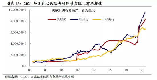 自身路径而言,紧急购债年内降速,但正常购债尚未到退出之时。欧央行在2021年3月将抗疫紧急购买计划(PEPP)的月度购债规模从600亿欧元上下提升至800亿欧元;2021年1月,欧央行正常购债计划(APP)的月度购债规模则从300亿欧元将至200亿欧元。换言之,2021年3月以来,欧央行购债实际上是有所提速的。PEPP原定于2022年3月前进行1.85万亿欧元的净资产购买,至2023年底前持续到期在投资。