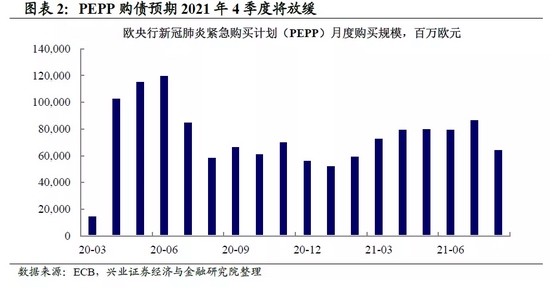 根据欧央行9月会议释放的信号来看,PEPP购债速度将在2021年四季度放缓。截至2021年8月,PEPP已净购买债券约1.33万亿欧元,假设接下来的7个月匀速购买、至2022年3月要达到原计划1.85万亿欧元的净购买,则未来每月需购债约730亿欧元。关注到8月购债规模已经降至650亿欧元,预期欧央行四季度的月购债规模可能将降至600亿欧元,如果经济如期复苏,2022年一季度可能会进一步降速,这也意味着至PEPP最终可能不会完全买到1.85万亿欧元。而同时,正常购债计划(APP)目前每个月200亿欧元的购债速度预期将维持。