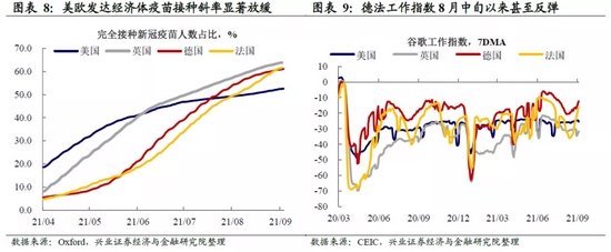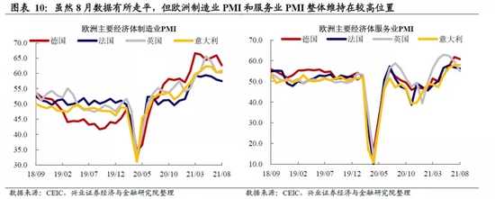 疫情:虽然变异病毒有所扰动,但欧洲活动受影响整体有限。疫情反复的扰动下,欧美经济体对疫情的响应开始明显“钝化”,虽然德法防疫政策自8月以来明显收紧,但是居民的出行和娱乐受影响整体非常有限,工作指数甚至出现反弹。在此背景下,虽然欧洲8月PMI小幅走弱,但整体仍然维持在较高平台。