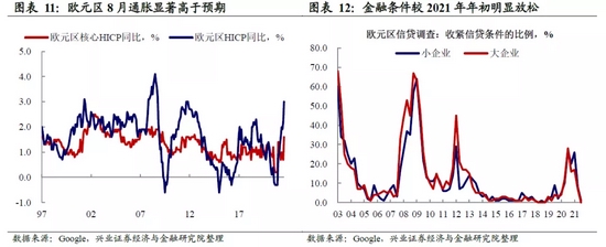 通胀的走高和金融条件的缓和也成为欧央行放风转鹰的契机。另一方面,受到大宗商品价格上涨、供需错配和全球运输供应紧张的影响(详参《除大宗外,全球供应链问题还出在哪里》),欧洲通胀也出现快速上行。而在欧央行持续放水的背景下,欧洲的企业和居民面临的金融条件,也较2021年年初已经出现了明显的改善,这些均称为欧央行官员释放转鹰信号的背景。