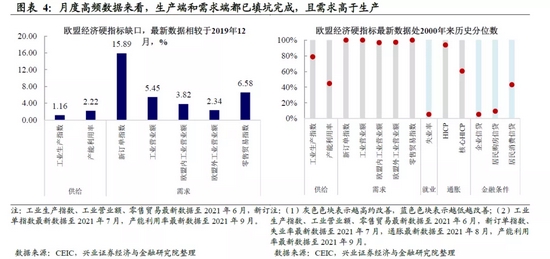 从硬指标来看,当前欧元区 “填坑”基本完成,需求好于供给。值得注意的是,欧洲的硬指标(即非PMI、信心指数等景气调查指标)整体公布较慢——当前仅可得到截至2021年年中的数据,基于此,我们想首先刻画欧洲当前复苏的基本样貌。