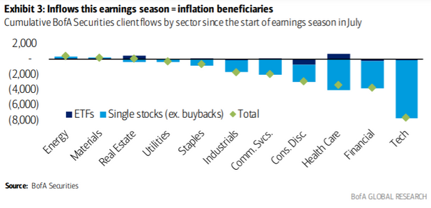 根据周三(9月9日)晚间报告中的图表,能源板块吸引了最多的资金流入,而科技股流出的资金最多,因为客户在第二季度财报季后都迅速撤离了这一板块。