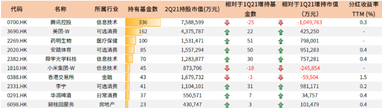 基金二季报显示,全市场共有1483只基金配置了港股市场,港股持仓总市值达到5836亿元。港股最受基金欢迎的公司依旧是腾讯和美团,分别有336和162只基金持股了腾讯和美团,持股市值分别达到758亿和437亿,港股基金中这两只股票也是配置的重点。