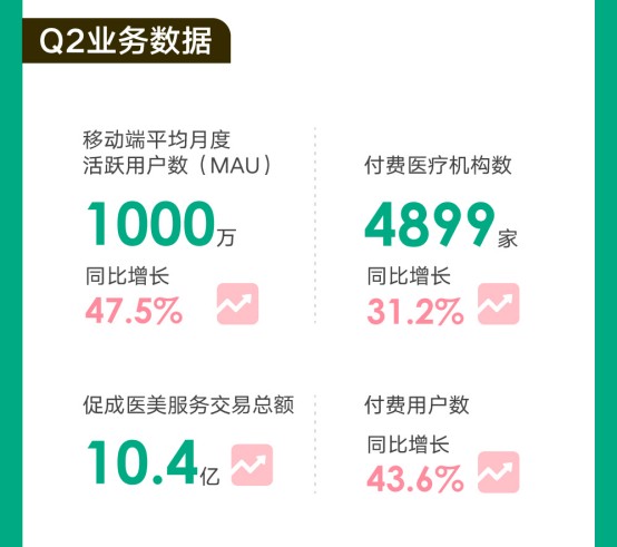 二季度,新氧移动端平均月活跃用户突破1,000万,同比增长47.5%。付费医疗机构数4,899家,同比增长31.2%。付费用户数24.5万人,同比增长43.6%。
