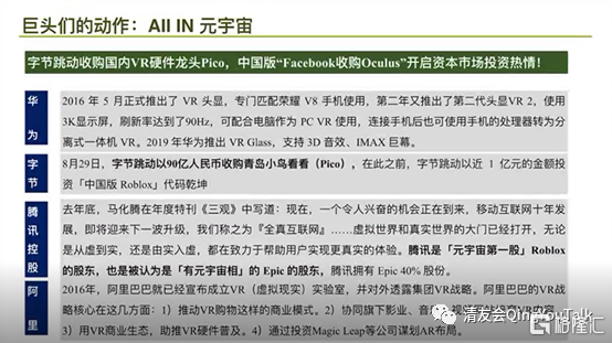 巨头正在纷纷布局元宇宙。其中最值得关注仍然是前面提到的Facebook。第一,它很关注新用户的增长。第二,它旗下有4个app,把四个平台完全整合起来,用一个ID可以在不同的宇宙里面去登录。第三,Facebook以前是没有经济体系的,只有用户和信息。Facebook在2019年推Libra,引起中美两国政府紧张。中国也提出要加快人民币数字货币的推动。Facebook随后推出了一个钱包作为它的账户,背后锚定的是美元作为重要支撑。第四,Facebook正在搭建一个计算平台,因为在移动互联网时代它没有入口,移动互联网时代的入口是苹果和谷歌。而Facebook希望在元宇宙里面要搭建出一个计算平台,这个平台就像VR眼镜一样。第五,Facebook花费10亿美金收购了一家公司做产品,可以把一个房间模拟成虚拟的映射到虚拟世界里,进行虚实结合门槛大大降低。因此我们可以看出,Facebook所做的一切就是为元宇宙提供一个基础的计算平台,并提出要5年内必须完成这个目标。