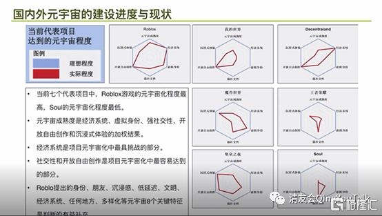 我在自己的书中概括了元宇宙最重要的六大核心技术。对应这六大的核心特征,可以对元宇宙以进一步进行完善。第一是元宇宙的成熟度、第二是沉浸式体验、第三是它的经济系统、第四是开放而且自由创作、第五是有没有虚拟的深身份、第六是强的社交性。Facebook的目的是希望未来在这里面每一个维度都达到极致。Roblox公司提供了大量给小孩玩的游戏,公司里面的经济系统是非常完善的,有虚拟身份,也有一定的社交性,开放自由创作70%到80%的收入会分给每个创作者,沉浸感也比较强。因此Roblox现在相当于元宇宙雏形。