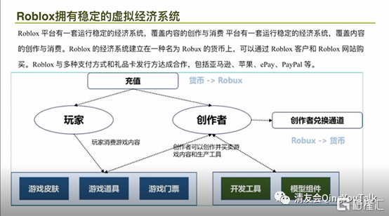 通过对Roblox公司进行研究,我们可以大概明白构成元宇宙这样的产品或称为经济体需要哪些核心要素。Roblox提供了一套开发工具以及模型组件,吸引了数百万的创作者,他们可以创作游戏的内容以及各种各样的插件和生产工具。这也意味着相当于有几百万人研发人员在其中开发了几千万各种各样的游戏。同时Roblox吸引的各类玩家与创作者,其本身就有社交圈属性。Roblox通过吸引更多的玩家来消费游戏的内容,包括购买游戏皮肤、道具、门票等等。这个过程中玩家们把美金充值换成里面的Roblox币,在其中进行消费,创作者们在获得了Roblox币后可以兑换成真实的货币,这样把整个世界搭建出一套非常稳定的虚拟经济系统和模型——有平台提供方、生产者、消费者等等,其商业模式和机理有一套稳定的货币支付结算体系。因为其游戏制作精良,玩家在其中形成各种各样的积分,都可以兑换成Roblox币并在虚拟世界中进行兑换,让每个玩家有深度的沉浸感,这是核心。