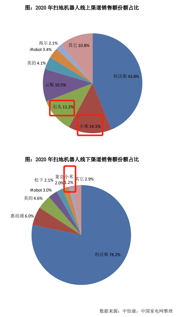 根据中国家电网发布的《2021年扫地机器人市场发展白皮书》,2020年石头科技的产品销售额,无论是线上还是线下渠道,均不如小米。甚至在线下渠道部分,石头科技仅处于“其他”一栏。