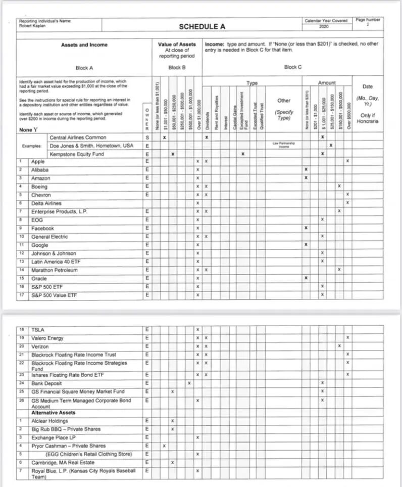 两天前,美联储12家地方联储中的11家都披露了自家主席2020年的财务状况,相比其他主席在金融市场非常保守的操作,达拉斯联储主席Kaplan去年在股市大手笔操作。根据报告,截止去年末,Kaplan共持有32只股票、基金等,包括鼎鼎大名的 苹果 、 亚马逊 、 谷歌 、 特斯拉 、 阿里 等等,且交易金额都超过100万美元。