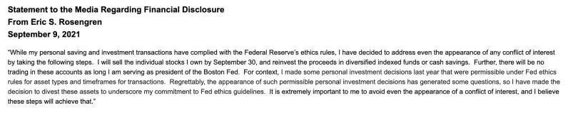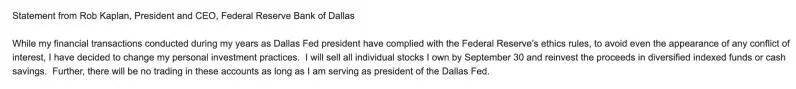 美东时间9月9日,美联储两位高官,达拉斯联储主席Robert Kaplan以及波士顿联储主席Eric Rosengren同时发布声明,因为“道德(ethic concerns)”原因将在本月底之前清空所有股票持仓,包括 特斯拉 、 亚马逊 等,随后资产将转入被动投资。