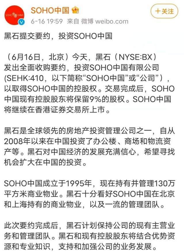 2021年6月,SOHO再一次发出收购公告,表示将以30亿美金,向黑石集团出售潘石屹和张欣的部分股份,公司不改变上市状态。