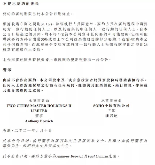 2021年9月10日,SOHO中国发布公告,表示鉴于目前满足收购要约的先决条件进展不足,双方一致认为无法在要约最后截止日当天或之前满足先决条件,在经商讨之后,各方一致同意,黑石终止对公司收购要约。