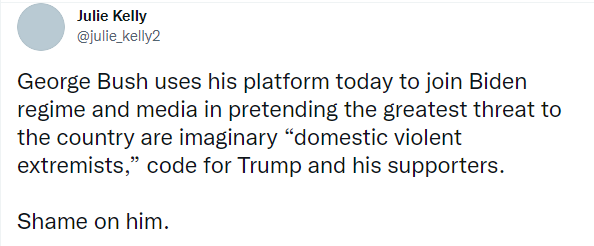 保守派人士朱莉·凯利在推特上写道:“小布什今天利用他的影响力加入拜登政府和媒体的行列,假装对美国最大的威胁是虚构的‘国内暴力极端分子’,把他们当作对特朗普及其支持者的代号。他太可耻了。”↓
