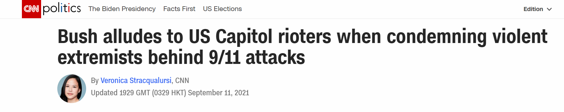 CNN:布什在谴责“9·11”袭击背后的暴力极端分子时,暗指(冲击)美国国会的暴徒