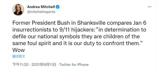 “前总统小布什在尚克斯维尔把1月6日的暴动者与9·11的劫机者相提并论:‘他们决心玷污我们的国家象征,他们是同样邪恶灵魂的孩子,我们有责任对抗他们。’哇”