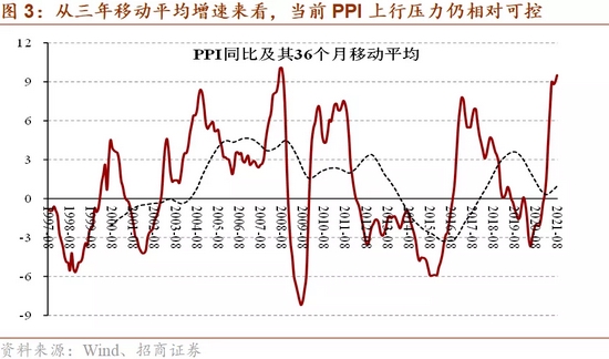 我国货币政策对PPI持续上行会有一定容忍。尽管8月PPI上升至9.5的高位,但若按照人民银行之前在陆家嘴论坛等场合的表示,要用去年、今年和明年连续三年的整体视角来观察PPI变化。从三年移动平均增速来看,当前PPI上行压力仍相对可控。