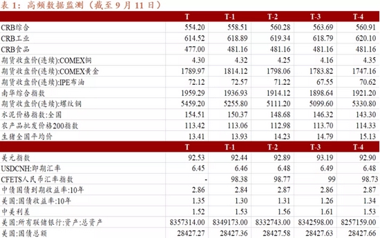 海外与国内商品价格分化延续,生猪价格持续下跌:本周CRB指数继续下行,9月9日CRB综合指数收盘554.0,较上周同期下行3.3,CRB工业收盘615.9,较上周下行1.6,CRB食品收盘475.0,较上周下行5.2。南华综合指数9月10日收盘1956.8,较前一周同期上行4.4。农产品批发价格200指数收盘113.7,较上周同期上行0.6。生猪全国平均价9月10日收盘12.9元/公斤,较上周下跌7.2%。本周,COMEX铜期货收盘均值4.3,较上周下跌0.4%;COMEX黄金期货本周收盘均值1790.0,较上周下跌1.3%;IPE布油收盘均值72.1,较上周下跌0.6%;螺纹钢期货收盘均值5459.2,较上周上涨3.9%。水泥价格指数9月10日收盘155.6,较上周同期上行4.0。