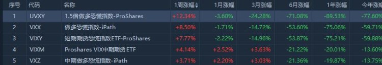 股指方面,本周做多恐慌指数ETF表现突出。其中,1.5倍做多恐慌指数ETF $UVXY 涨幅居前,一周累计涨超12.34%。做多恐慌指数ETF $VXX 一周累计涨超8%;