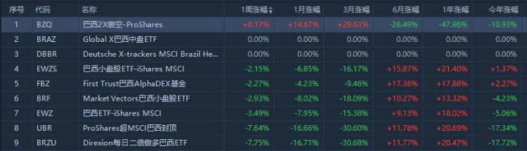 区域ETF中,本周做空巴西ETF表现领先。其中巴西2X做空ETF $BZQ 一周累计涨超6%,三月累计涨近30%。而每日二倍做多巴西ETF $BRZU 一周累计跌超7.75%。