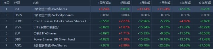 按照最活跃合约计算,本周黄金期货价格录得跌幅,为5周以来的首周下跌,黄金期货价格累计下跌2.3%。白银期货价格下跌约3.6%。表现在ETF中,2倍做空白银ETF $ZSL 一周大涨8.24%。