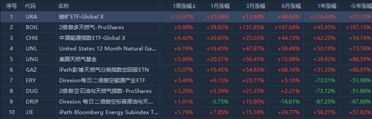能源方面,原油期货周五收高。本周美国WTI原油上涨0.6%,布伦特原油上涨0.4%。表现在ETF中,铀矿ETF $URA 一周累计涨超10%;2倍做多天然气ETF $BOIL 一周累计涨近10%,今年以来涨近200%。