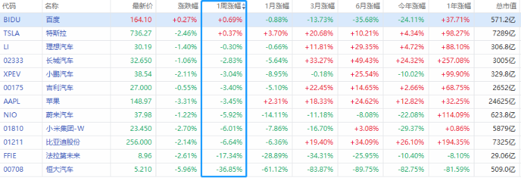 一、一周新能源车公司涨跌幅榜