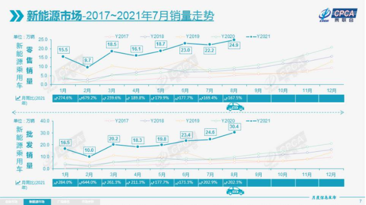 但8月新能源乘用车批发量达到30.4万辆,同比大增202.3%,环比亦增长23.7%。零售销量则达到24.9万辆,同比增长167.5%,环比亦增12.0%。1-8月新能源车零售达到147.9万辆,同比增长202.1%。