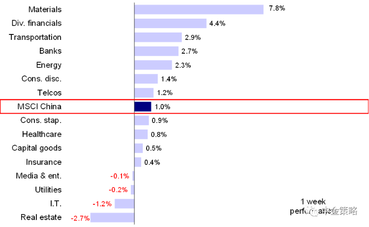 在亚洲股市普遍走高、尤其是A股市场上证综指收盘价创六年新高背景下,上周海外中资股市场也继续向好。主要指数中,恒生指数上涨1.2%,恒生国企指数和MSCI中国指数涨幅均为1.0%。上周初一开始港股市场的表现依然是主要由成长板块所推动,但周四监管压力再度升温导致成长板块受挫,整周恒生科技指数仅小幅上涨0.3%。板块方面,周期板块继续走高,其中原材料板块、多元金融和交运板块分别上涨7.8%、4.4%和2.9%,而房地产、信息技术、公用事业和传媒娱乐板块分别下跌2.7%、1.2%、0.2%和0.1%。