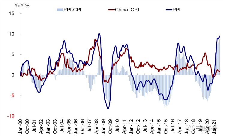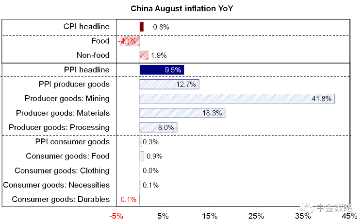 图表:在大宗商品价格推动下,8月PPI大幅攀升9.5%