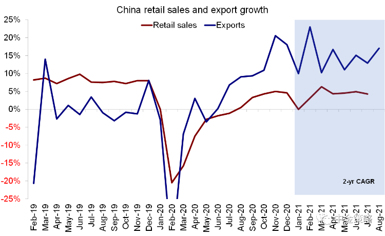 宏观环境方面,最新发布的8月经济数据表明虽然外需持续强劲,但经济增速整体放缓,而且不平衡态势仍在继续。在大宗商品价格大幅上涨推动下,8月PPI涨幅大幅攀升至9.5%,创出2008年以来新高。PPI与CPI剪刀差刷新纪录,扩大至8.7%。CPI较为疲弱表明国内消费需求持续低迷,尤其是在上个月国内局部地区新冠疫情复发的背景下。PPI与CPI剪刀差扩大也表明下游企业盈利能力进一步削弱。我们在《1H21业绩回顾:整体强劲但分化凸显》报告中指出,下游行业利润率已经出现下滑。原材料价格居高不下以及内需疲弱两大因素使得下游消费类企业下半年盈利压力不断上升。与此同时,社融和信贷数疲弱,例如居民和企业短期与中长期新增贷款放缓,表明下游需求持续低迷。不过,上周公布的8月出口数据成为为数不多的亮点,好于市场预期。尽管国内部分地区疫情反弹,但8月出口同比仍然大幅增长25.6%。往前看,我们认为出口仍然有望体现韧性并成为主要的增长亮点,尤其是在秋季假日旺季前夕,但可能无法改变整体增长趋缓的态势,更何况当前上下游不均衡的修复态势。在此背景下,虽然货币政策的全面宽松可能还有待时日,但整体政策仍将保持相对宽松,进而提供良好的流动性环境。