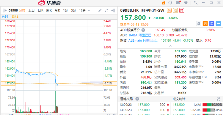 华盛资讯9月13日消息,阿里午后跌超6%,现报157.8港元每股,最新总市值34223亿港元。