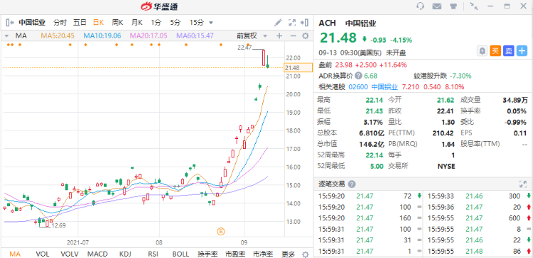 华盛资讯9月13日消息,今日美股盘前,中国铝业(ACH)涨11.64%,今日港股收涨8.1%,A股涨停。此前伦敦金属交易所(LME)铝价格触及3000美元/吨,为2008年7月以来的最高水平。