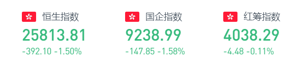 截至周一收盘,截至收盘,恒生指数跌392.1点或1.5%,报25813.81点,全日成交额达1503.36亿。国企指数跌1.58%,报9238.99点,红筹指数跌0.11%,报4038.29点。