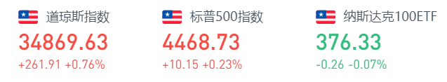 截至周一收盘,道指涨261.91点或0.76%,报34869.63点;纳指跌9.91点或0.07%,报15105.58点;标普500指数涨10.15点或0.23%,报4468.73点。