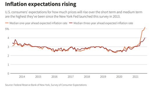 该月度调查显示,8月份美国消费者对未来一年的通胀预期上升至5.2%的中值,为连续第10个月走高;未来三年的通胀预期上升至4.0%。该调查于2013年启动,两项指标均创下有史以来的最高水平。