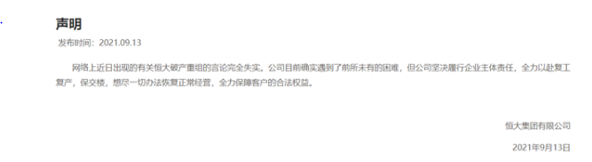 9月13日,恒大集团发布声明称,网络上近日出现的有关恒大破产重组的言论完全失实。公司目前确实遇到了前所未有的困难,但公司坚决履行企业主体责任,全力以赴复工复产,保交楼,想尽一切办法恢复正常经营,全力保障客户的合法权益。