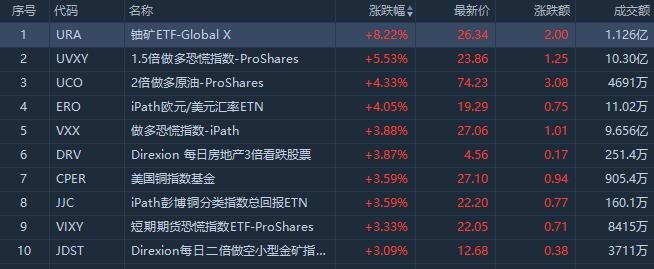 大宗商品ETF方面,铀矿ETF $URA 大涨8.22%,成交额1.126亿美元;美国铜指数基金ETF $CPER 涨3.59%,成交额905.4万美元。