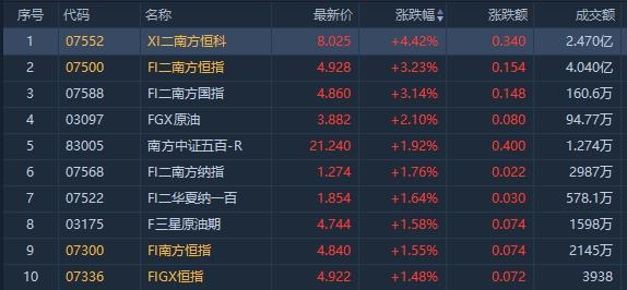 今日港股市场,涨幅居前的有南方两倍做空恒科ETF $07552.HK 涨4.42%,成交额2.47亿港元;南方两倍看空国指ETF $07500.HK 涨3.23%,成交额4.04亿港元。