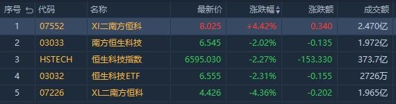 南方两倍做多恒科 $07226.HK 跌4.36%,成交额1.965亿港元;