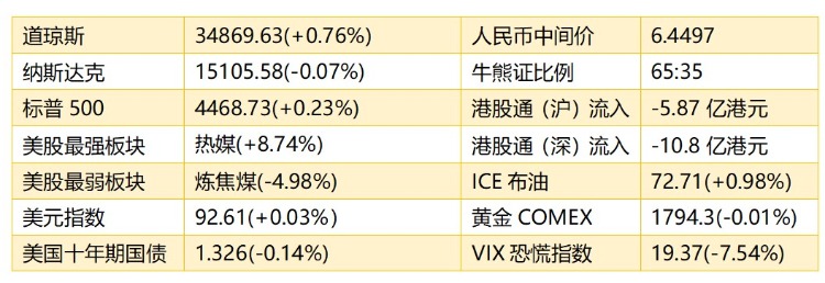 1、隔夜美股截至收盘,道指涨261.91点或0.76%,报34869.63点;纳指跌9.91点或0.07%,报15105.58点;标普500指数涨10.15点或0.23%,报4468.73点。道指与标普500指数经历了连续5个交易日下跌之后反弹,纳指连续第4个交易日收跌。港股ADR指数上涨,按比例计算,收报25842点,涨29.10点或0.11%。