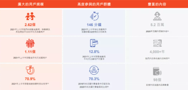 根据灼识咨询的数据,截至2021年6月30日止六个月,喜马拉雅移动端主应用程序平均月活跃用户在中国在线音频应用程序中排名第一。同期,就用户移动端总收听时长和在线音频总收入而言,公司是中国最大的在线音频平台。