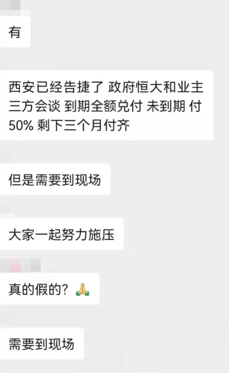 “西安已经告捷,政府、恒大和业主三方会谈,到期全额兑付,未到期,付50%,剩下三个月付齐”等内容。