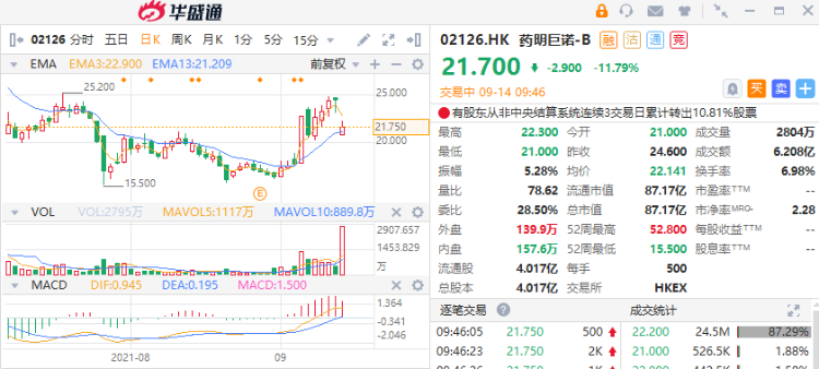 华盛资讯9月14日消息,药明巨诺-B(02126)早盘低开14.63%,现跌近12%,报21.7港元。