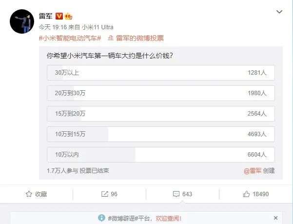 雷军曾在微博发起投票,“你希望小米的第一辆车是什么价钱?”接近40%的人支持10万元以下,其次是10-15万元,选择30万元以上的,不到8%。