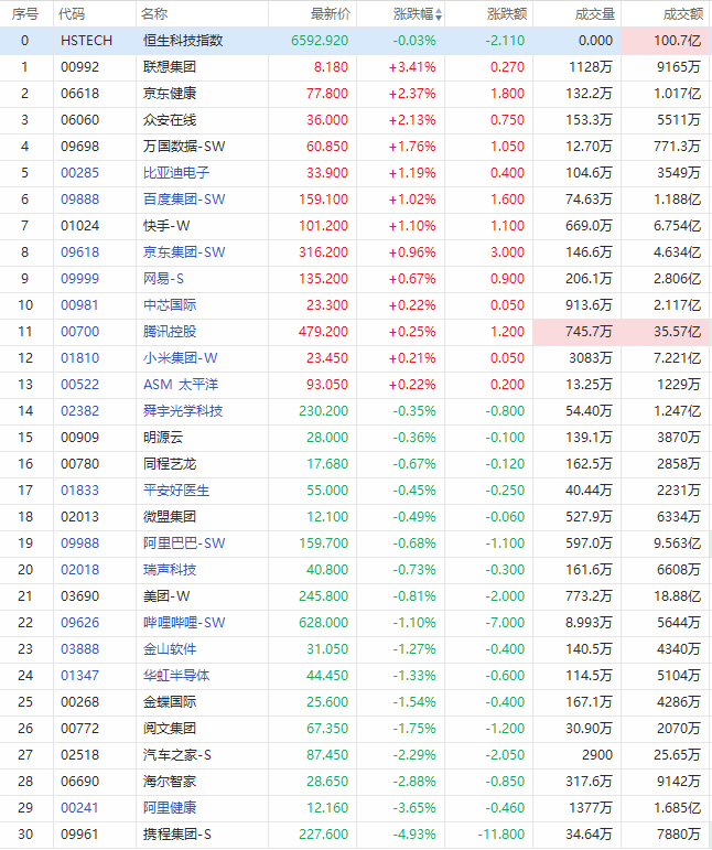 其中,联想集团涨超3%;众安在线、京东健康涨超2%;比亚迪电子、百度、快手涨超1%;京东、腾讯、网易、中芯国际等微涨。