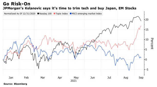 Kolanovic和他的同事在一份报告中写道:“德尔塔毒株影响消退,叠加供应链问题和宽松货币政策所带来的通胀现象,我们预计,与再通胀交易强相关的标的会有突出表现。”