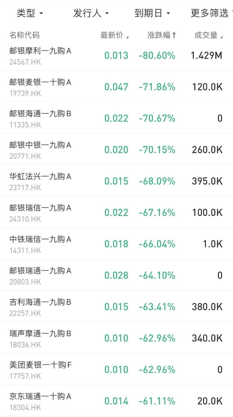 在今日跌幅榜中,邮银摩利一九购A跌80.60%;此外,华虹发法兴一九购A跌68.09%。